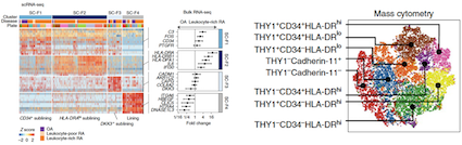 2019年5月,Nature Immunology報(bào)道關(guān)于類(lèi)風(fēng)濕性關(guān)節(jié)炎(RA)的研究。作者對(duì)來(lái)自RA或骨關(guān)節(jié)炎(OA)患者的51個(gè)滑膜組織樣品的T細(xì)胞、B細(xì)胞、單核細(xì)胞和成纖維細(xì)胞進(jìn)行單細(xì)胞RNA測(cè)序(scRNA-seq)、質(zhì)譜流式檢測(cè)、 轉(zhuǎn)錄組測(cè)序(bulk RNA-seq)和普通流式細(xì)胞檢測(cè)。利用基于5,265個(gè)scRNA-seq圖譜典型相關(guān)分析的綜合策略,作者鑒定了18個(gè)獨(dú)特的細(xì)胞群。通過(guò)在單細(xì)胞層面對(duì)跨數(shù)據(jù)模態(tài)進(jìn)行整合,精確定義了特定細(xì)胞亞群在RA和慢性炎癥中的作用。