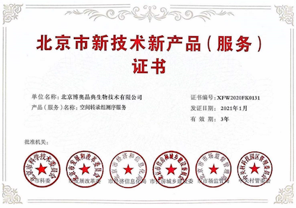“北京市新技術(shù)新產(chǎn)品(服務(wù))認(rèn)定”旨在推動(dòng)高新技術(shù)產(chǎn)業(yè)的發(fā)展,作為北京市新技術(shù)新產(chǎn)品,應(yīng)擁有自主知識(shí)產(chǎn)權(quán),并具有技術(shù)先進(jìn)性和創(chuàng)新性。本次喜獲“空間轉(zhuǎn)錄組測(cè)序服務(wù)”榮譽(yù)證書(shū)是各委員會(huì)對(duì)博奧晶典創(chuàng)新能力的高度贊揚(yáng)和肯定,同時(shí)體現(xiàn)了博奧晶典空間轉(zhuǎn)錄組測(cè)序服務(wù)在行業(yè)內(nèi)的技術(shù)優(yōu)勢(shì)。