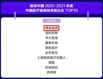 本次評(píng)選中獲得2020-2021年度中國醫(yī)療健康獨(dú)角獸企業(yè)TOP10的榮譽(yù),進(jìn)一步力證了博奧晶典在生命科學(xué)領(lǐng)域的發(fā)展?jié)摿Γ苍俅物@示了業(yè)界對(duì)博奧晶典的關(guān)注與肯定。