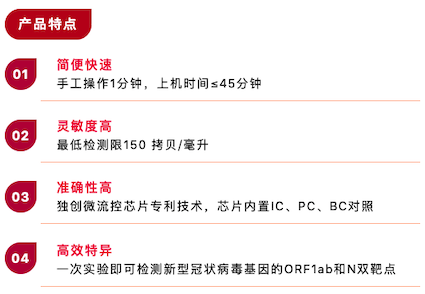 基于全新一代先進的芯片實驗室(Lab-on-a-chip)設計理念,化繁為簡,檢測時僅需將樣本保存液加入芯片,封閉芯片后即可上機,手工操作小于1分鐘。生物反應全程(包括核酸提取、核酸純化、擴增反應、核酸檢測和結(jié)果判讀等)均集成在一個整體密閉、內(nèi)部分區(qū)的微流控芯片內(nèi),由全自動核酸分析儀完成,因此無需專業(yè)分區(qū)實驗室,無需人工干預,最大程度降低操作人員感染及樣本間交叉污染的風險。45分鐘完成實驗全過程,最快可在35分鐘內(nèi)檢出新冠陽性樣本,檢測靈敏度可達150拷貝/毫升,在截至目前國內(nèi)獲批的同類產(chǎn)品中靈敏度最高,真正實現(xiàn)“樣本進-結(jié)果出”。
