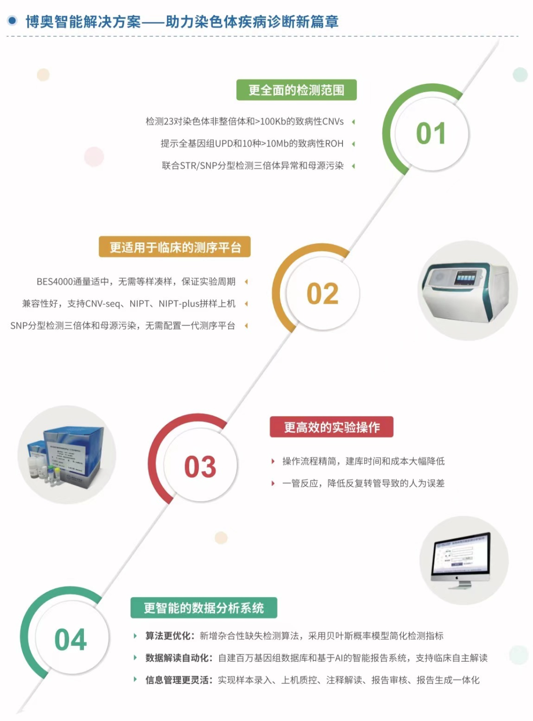 博奧晶典CNV-seq系列產(chǎn)品全面升級,在原有產(chǎn)品檢測23對染色體非整倍體、100Kb以上缺失/重復(fù)的基礎(chǔ)上,新開發(fā)了特有的生信算法并獲得專利授權(quán),新增基因組純合區(qū)域ROH檢測,可提示全基因組UPD和10種>10Mb的致病性ROH;此外,博奧晶典自主研發(fā)的基于BES4000的SNP分型技術(shù)有效提示三倍體異常和定量鑒定5%以上的樣本交叉污染,為臨床提供更具性價比的檢測產(chǎn)品,為出生缺陷精準(zhǔn)防控提供更全面的解決方案。
