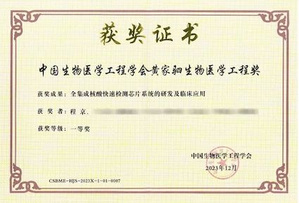在程京院士帶領(lǐng)和國家重點(diǎn)研發(fā)計(jì)劃支持下,“全集成核酸快速檢測(cè)芯片系統(tǒng)的研發(fā)及臨床應(yīng)用”項(xiàng)目突破了一系列關(guān)鍵技術(shù)難題,首創(chuàng)了全集成核酸快速檢測(cè)芯片系統(tǒng)。成果達(dá)到“國內(nèi)首創(chuàng)、國際領(lǐng)先”,儀器和芯片試劑盒于2021年通過國家藥監(jiān)局應(yīng)急審批獲Ⅲ類醫(yī)療器械證書,通過歐盟CE認(rèn)證。項(xiàng)目成果被評(píng)為“2021年中國醫(yī)藥生物技術(shù)十大進(jìn)展”,并被納入《北京市首臺(tái)(套)重大技術(shù)裝備目錄(2021年)》,榮獲CAETS(國際工程院理事會(huì))頒發(fā)的首屆唯一一項(xiàng)“2021 CAETS傳播獎(jiǎng)-工程成就獎(jiǎng)”。