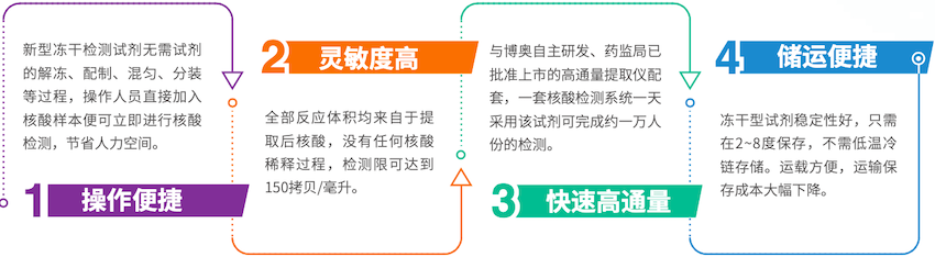 ? ? ? 本試劑盒基于RT-PCR技術(shù),將擴(kuò)增反應(yīng)所用的緩沖液、酶、引物、探針混合到凍干微球中,采用96孔板或八連排管預(yù)裝凍干微球,在反應(yīng)孔中直接加入提取后的核酸樣本進(jìn)行檢測(cè),各樣本之間的檢測(cè)結(jié)果互不干擾,獨(dú)立性好,結(jié)果準(zhǔn)確,可一次分別實(shí)現(xiàn)對(duì)新型冠狀病毒ORF1ab基因和N基因的檢測(cè)。(國械注準(zhǔn):20223401469)