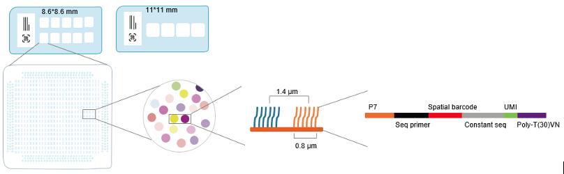 芯片包括兩種類型:組織透化芯片和基因表達芯片,表達芯片捕獲區(qū)域面積為11*11mm。在捕獲區(qū)域內存在著數千萬的探針簇,每個探針簇的直徑為0.8 μm,每平方微米有約18000 條探針,用于捕獲轉錄本(圖1)。每條探針捕獲序列由5 部分組成 :